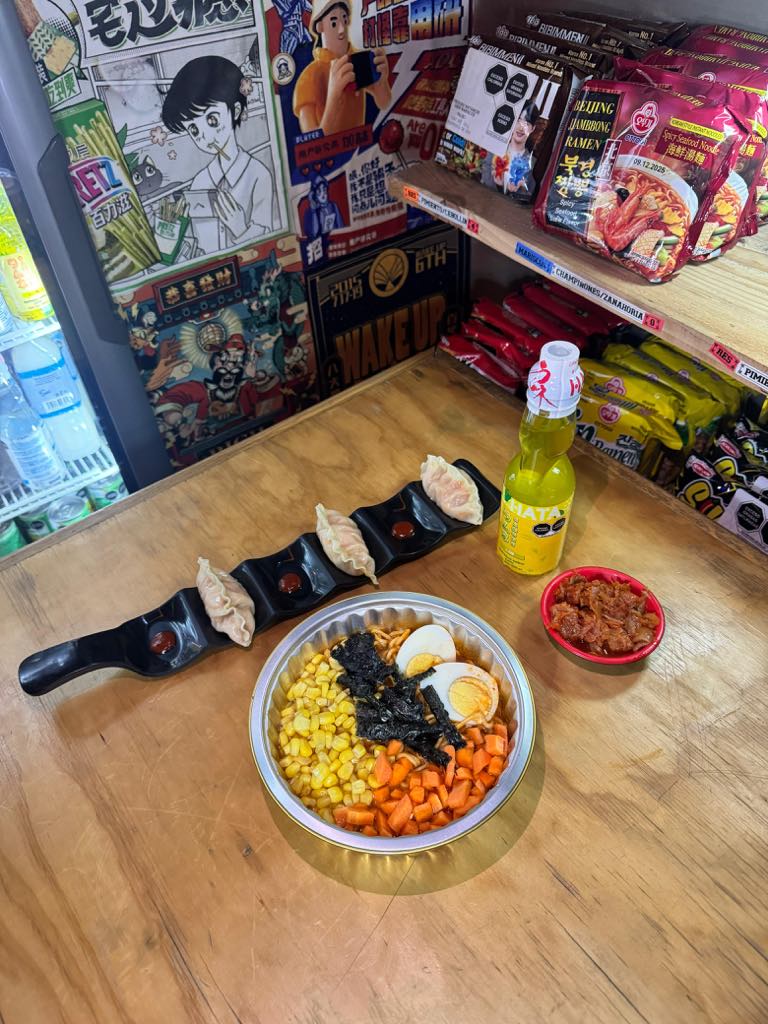 Here, food feels like an interactive ritual rather than just a fixed order. Instead of a static menu, you choose your ramen packet from a vibrant wall display, deciding how to build a bowl that suits your moment — whether you’re drawn to something fiery and bold or a gentler blend of flavors. Add-ons, from verdant vegetables to tender proteins, enhance each bowl, offering something richly personal with every visit. The drink selection follows that same thoughtful thread, with choices that nod to familiar Asian favorites alongside intriguing twists.